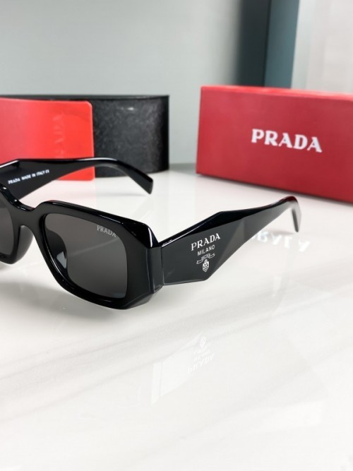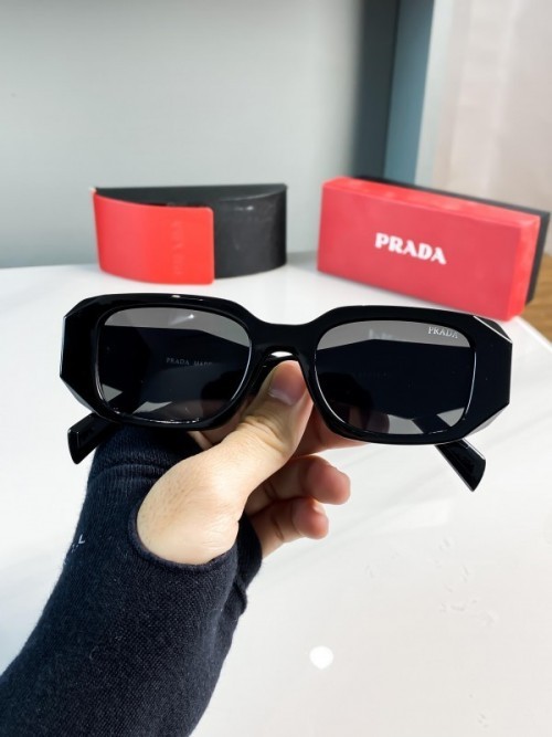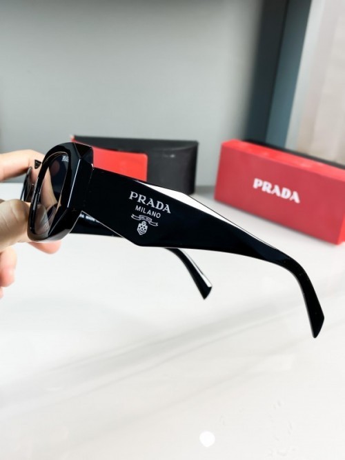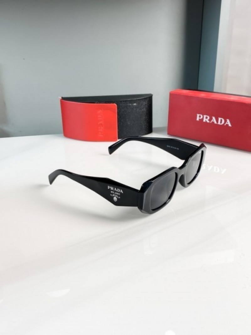 These are Prada Unisex sunglasses with black lenses. Details:- Brand: Prada Gender: Unisex Lens Color: Black Frame Color: Black Features: A rectangular frame shape with a subtle Prada logo on the temples.